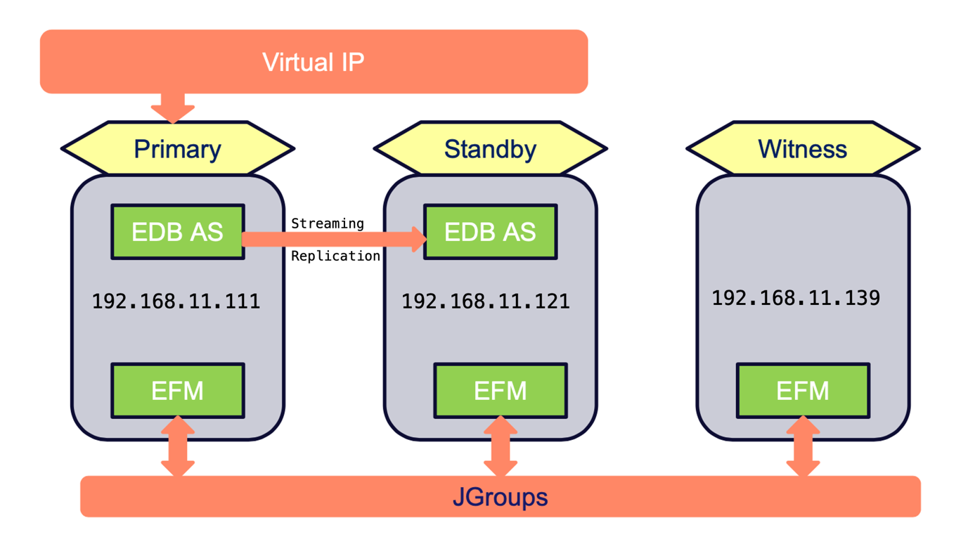 In this document, we considered one primary, one standby and a witness node in the EFM cluster as per below architecture. In case there are more than one standby databases we may skip witness node.