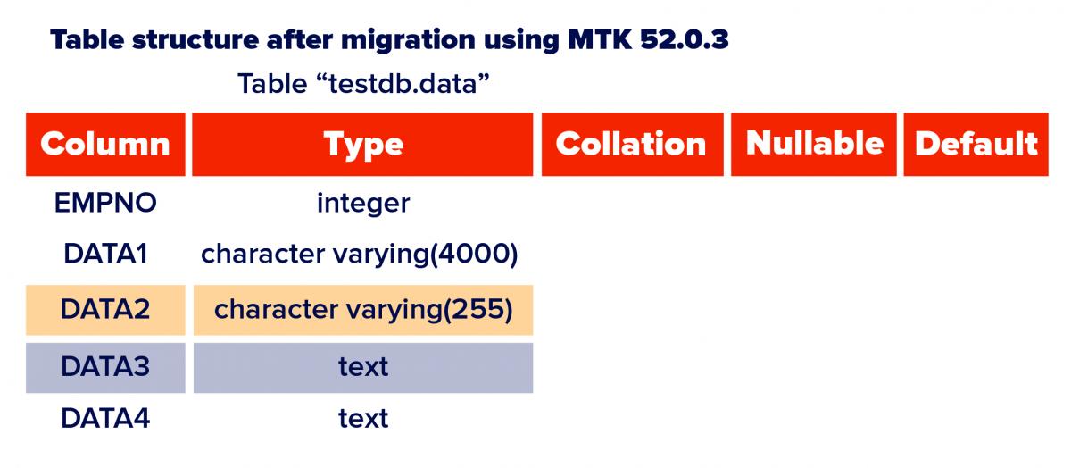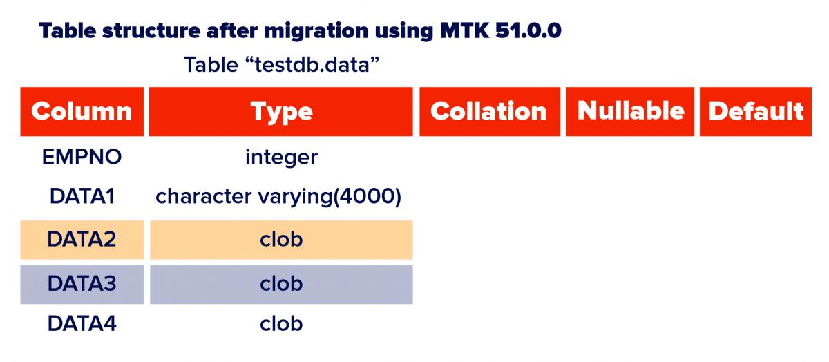 Earlier this release, MySQL’s TEXT, TINYTEXT, MEDIUMTEXT, and LONGTEXT data types were mapped to Advanced Server’s CLOB data type. Migrating CLOB data is a time taking process as MTK migrates one row at a time, by default. As the TEXT family data types already exist in Postgres and Advanced Server, with this release, MySQL’s TEXT type columns are migrated to Advanced Server’s TEXT type columns. This helped in improving the overall data migration performance.