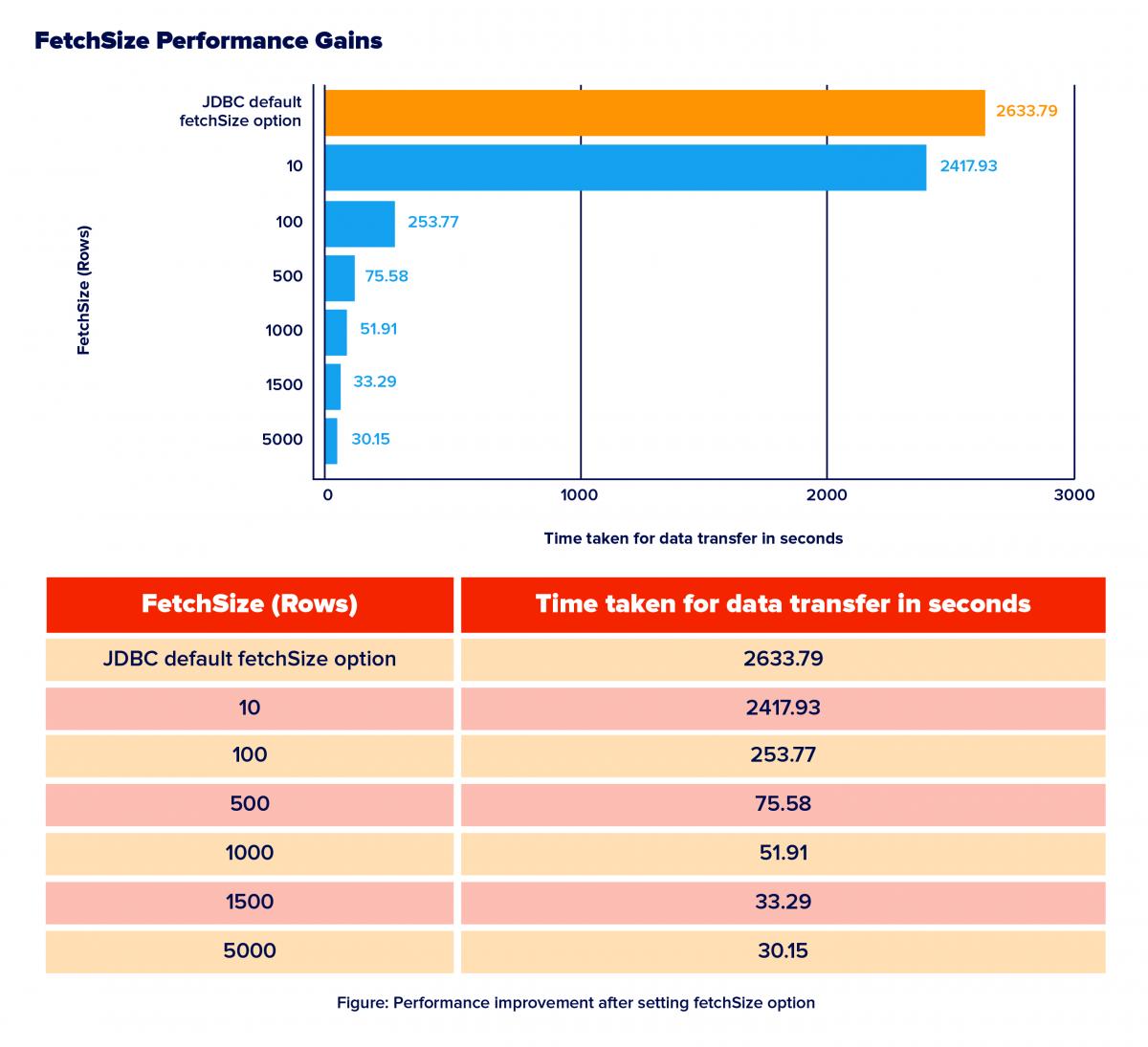 After using the appropriate fetchSize option, the performance has improved by 98% on an average. Note: You may not see further significant improvement post a certain fetchSize value.