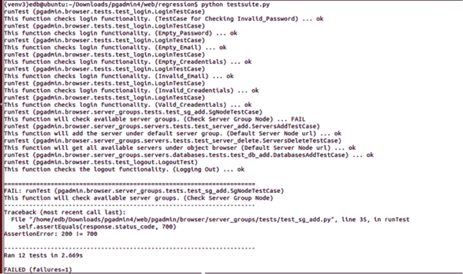 PgAdmin 4 boasts a very modular and pluggable architecture, so having a pluggable test framework for pgAdmin 4 was a no-brainer. The Quality Assurance Team at EnterpriseDB® (EDB™) developed the test framework for pgAdmin 4, creating a design that allows pgAdmin developers to easily add test cases and run the test suite in a jiffy.