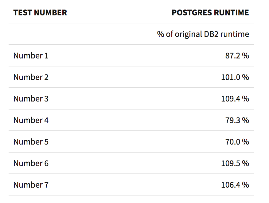 This option was also a grounds for worry. Obviously an expensive database option, that was known to bring real benefits to DB2 database performance, would outperform Postgres, right? Would we be able to come near DB2 database performance when running on Postgres?