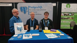 After the ceremony, the award was on display at the PostgreSQL table in the OSCON exhibition hall. Basil Borque, Robert Bernier, and Grant Holly were among several volunteers including Christophe, Michel Pelletier and Tim Bruce who answered questions and made conversations about PostgreSQL during a well attended exhibition.