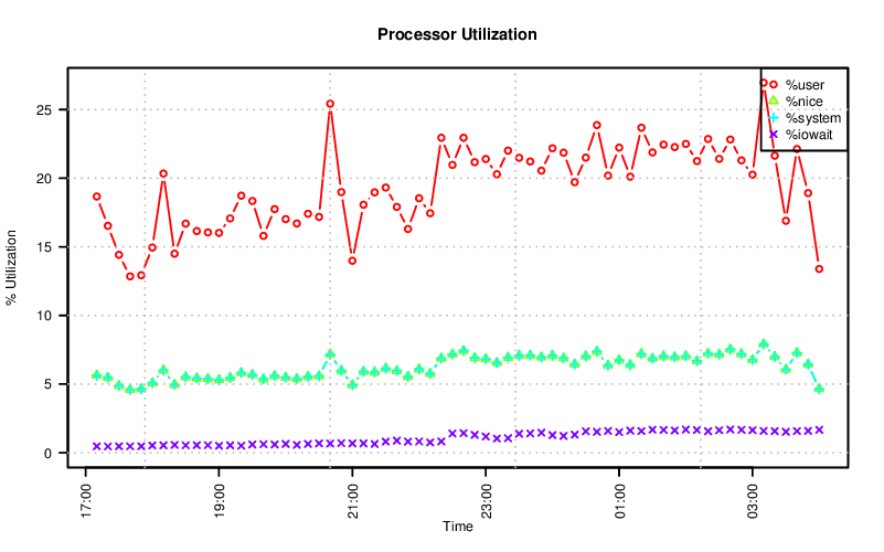 df <- read.csv("sar.dat", sep = ";", header=T, comment.char = "") df$timestamp <- strptime(df$timestamp, "%Y-%m-%d %H:%M:%S") type <- c("X.user", "X.nice", "X.system", "X.iowait") label <- c("%user", "%nice", "%system", "%iowait") color <- rainbow(4) pch <- seq.int(1, 4) bitmap("sar-R.png", type="png16m", units="px", width=800, height=500, res=150, taa=4, gaa=4) for (i in 3:1) { df[[type[i]]] <- df[[type[i]]] + df[[type[i+1]]] } par(las=2) plot(df$timestamp, df$X.user, type = "b", col = color[1], ylim = c(0, max(df$X.user, na.rm = T)), main="Processor Utilization", xlab="Time", ylab="% Utilization") for (i in 2:4) { points(df$timestamp, df[[type[i]]], type = "b", pch = pch[i], col=color[i]) } legend('topright', label, pch=pch, col=color) grid(col="gray") dev.off()