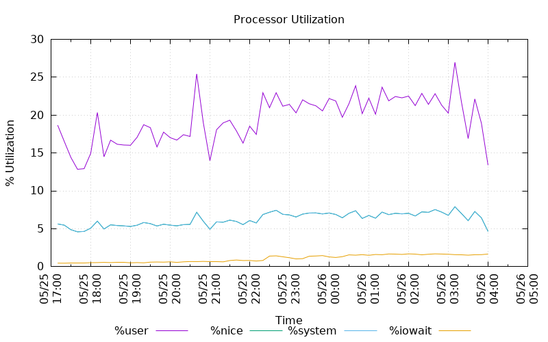 gentoo 599 2017-05-25 17:10:01 UTC all %user 13.03 gentoo 599 2017-05-25 17:10:01 UTC all %nice 0.01 gentoo 599 2017-05-25 17:10:01 UTC all %system 5.16 gentoo 599 2017-05-25 17:10:01 UTC all %iowait 0.47 gentoo 599 2017-05-25 17:10:01 UTC all %steal 0.00 gentoo 599 2017-05-25 17:10:01 UTC all %idle 81.32