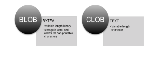 In Postgres, the simplest representation of how LOBs are handled is shown below, where BLOBs are equivalent to the BYTEA data type and CLOBs are equivalent to the TEXT data type: