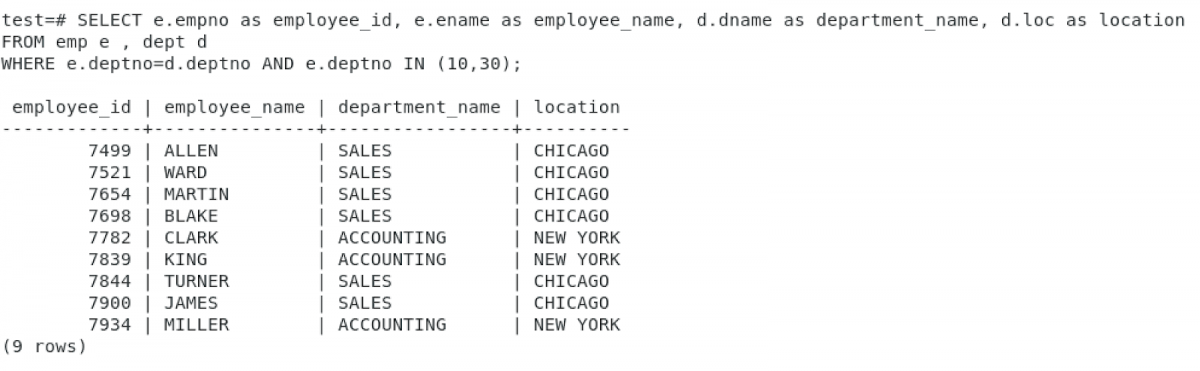 WHERE e.deptno=d.deptno AND e.deptno IN (10,30);