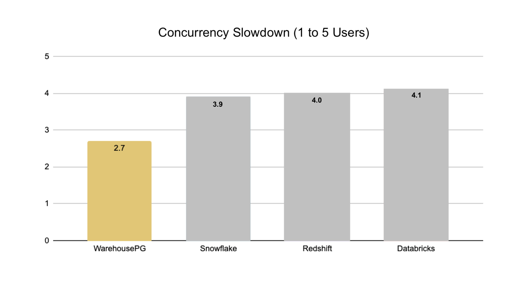 WarehousePG delivers up to 52% more consistent concurrency performance than cloud platforms when scaling from 1 to 5 concurrent users.
